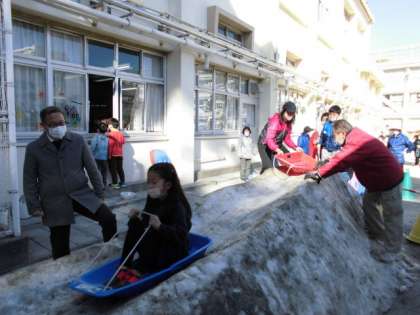 先日、「いぶき」と保護者の皆様が作ってくださった雪のすべり台で遊びました。