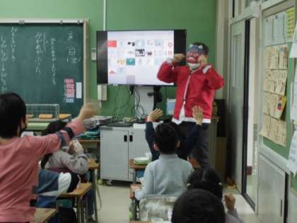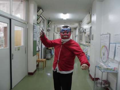 今日の給食は節分メニューです。(いわしのひつまぶしご飯、すまし汁、大豆の甘辛あげ、豆乳プリンイチゴソースかけ)給食の時間には、オニがやってきました。