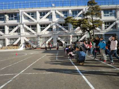 学年ごとに的に向かって玉を投げ、いくつ入ったかを競いました。