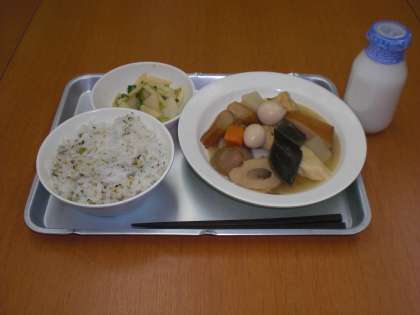 今日の給食は、菜めし・おでん・かぶのレモンじょうゆかけ・牛乳です。