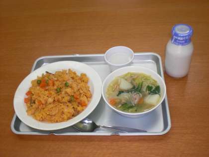 今日の給食は、チキンライス・ベーコンと野菜のスープ・ホワイトゼリー・牛乳です。