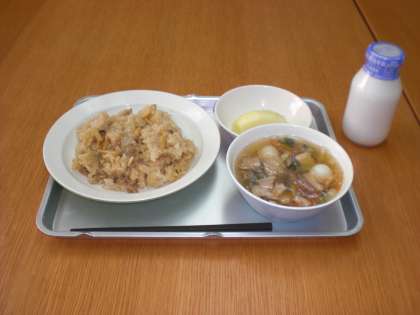 今日の給食は、中華おこわ・春雨スープ・りんご・牛乳です。