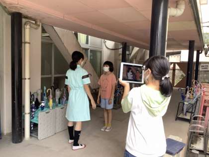 その単元で習った英語でのやりとりを行ない、その様子を動画で提出します。