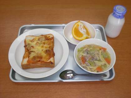 今日の給食は、ピザトースト・ヌードルスープ・いよかん・牛乳です。