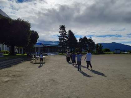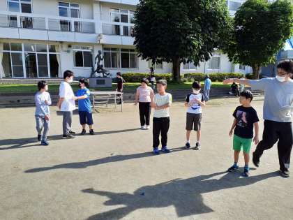 世田谷小が朝会の体操の当番です。これから練習します。