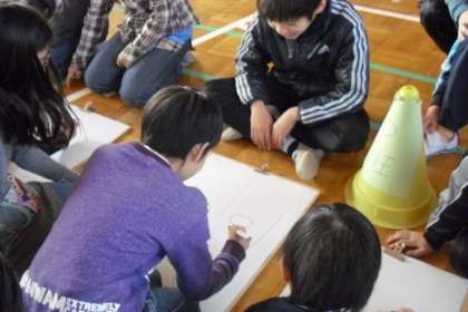 3月15日(木)、全校似顔絵集会が開かれました。お世話になった6年生の似顔絵をたてわり班で描きました。できあがった顔に、6年生は喜んでいました。