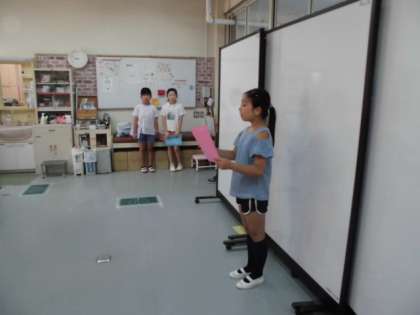 児童代表の言葉は4年生です。1学期に頑張ったことをもとに、2学期頑張りたいことを発表しました。「自分から声をかける」「あきらめないで挑戦する」など、とても前向きです。