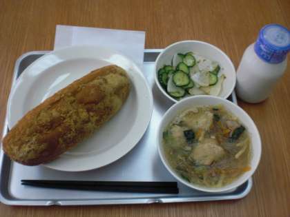 4月17日(火)、今日の給食は、あげパン、肉団子入り春雨スープ、きゅうりと大根のごま風味、牛乳です。