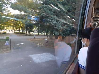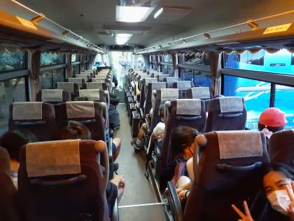 バスに乗りました。出発順番待ちです。