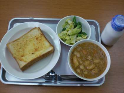 4月26日(木)、今日の献立は、ガーリックトースト、ビーンズシチュー、ブロッコリーのサラダ、牛乳です。