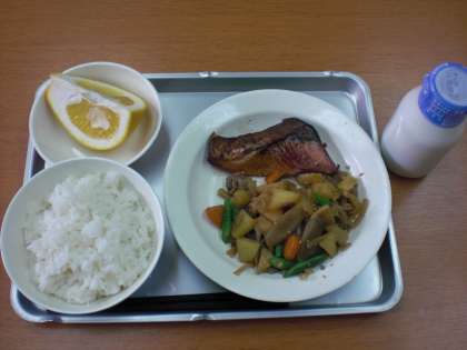 5月1日(火)、今日の給食は、ごはん、魚の照り焼き、きんぴら風炒め煮、くだもの、牛乳です。