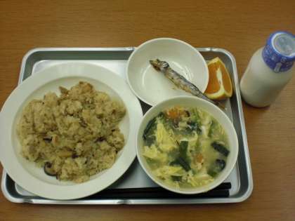 5月2日(水)、今日の献立は、中華おこわ、焼きししゃも、にらたまスープ、くだもの、牛乳です。