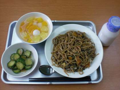 5月8日(火)、今日の献立は、ソース焼きそば、きゅうりの中華味、フルーツ白玉、牛乳です。