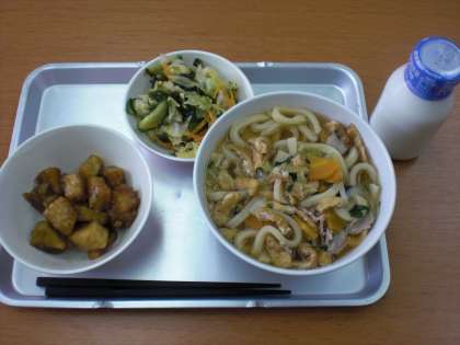 5月16日(水)、煮込みうどん、いかとさつま芋の揚げ煮、わかめサラダ、牛乳です。