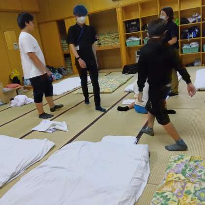 布団敷き2人一組で頑張っています