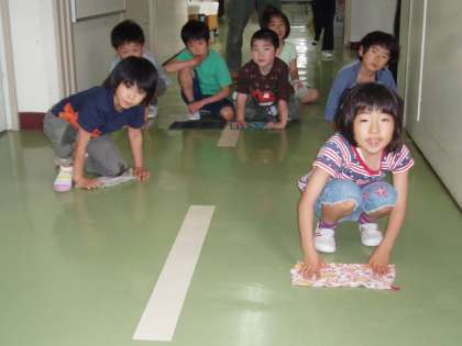 世田谷小学校は校舎内の床がいつもピカピカです。主事さん方が毎日きれいに磨いてくれることもありますが、実は小さな「そうじ名人」がたくさんいるのです。