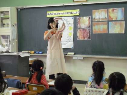 6日(水)に歯科指導がありました。歯のそめ出しをして、赤くなったみがき残しの部分をみがく練習をしました。きれいになった歯を鏡で見て、満足そうでした。