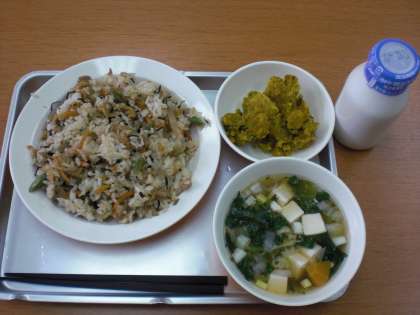 6月8日(金)、今日の献立は、五目ごはん、豆腐汁、かぼちゃの含め煮、牛乳です。