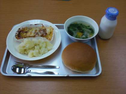 6月13日(水)、今日の献立は、ミルクパン、魚のビザ風、粉ふきいも、野菜スープ、牛乳です。