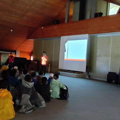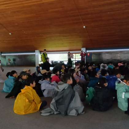 ビレジの方から野生動物について教えてもらっています。各クラスカメラを1台ずつ仕掛けます。