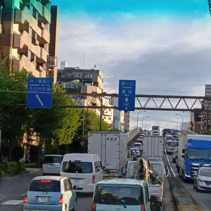 現在、高井戸陸橋手前、環八中の橋まで渋滞中です。工事だと電光掲示板に書いてありました。あ〜 関係ない情報、電池も後少し…