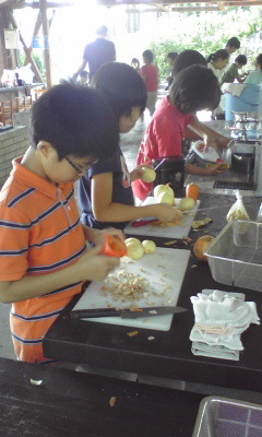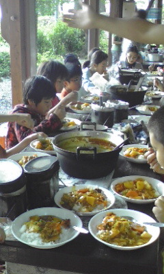 竈で火をおこし野菜の皮むき、包丁でのカッティングをして、みんなの汗と協力とで美味しいカレーライスを完成させました。