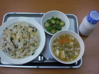 6月29日(金)、今日の献立は、青菜のチャーハン、麻婆汁、きゅうりの中華味、牛乳です。