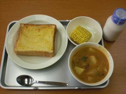 7月10日(火)、今日の献立は、ガーリックトースト、ハンガリアンシチュー、蒸しとうもろこし、牛乳です。