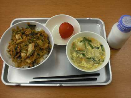 7月11日(水)、今日の献立は、キムチ丼、にらたまスープ、くだもの、牛乳です。