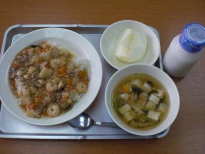10月11日(木)、今日の献立は、あんかけチャーハン、豆腐汁、くだもの、牛乳です。