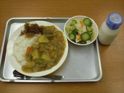 10月18日(木)、今日の献立は、カレーライス、福神漬、野菜の甘酢かけ、牛乳です。