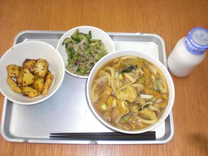 10月31日(水)、今日の献立は、カレーうどん、野菜のゆかりかけ、大学いも、牛乳です。