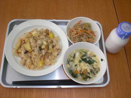 11月7日(水)、今日の献立は、吹き寄せごはん、かきたま汁、ごま酢かけ、牛乳です。