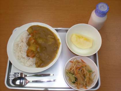 11月8日(木)、今日の献立は、チキンカレーライス、こんにゃくサラダ、くだもの、牛乳です。