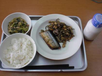 11月14日(水)、今日の献立は、ごはん、魚の塩焼き、きざみこんぶの五目煮、きのこ入り煮びたし、牛乳です。