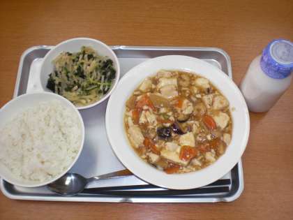 11月16日(金)、今日の献立は、ごはん、豆腐の五目炒め、じゃこのサラダ、牛乳です。