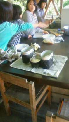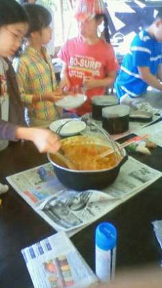 今夜のご飯は、カレーライス。ジャガイモをむいたり、玉ねぎ、人参、しっかり調理。お米も研いで火を起こしみんなでがんばりました。