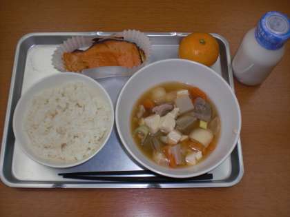 11月22日(木)、今日の献立は、ごはん、魚のみそマヨネーズ焼、けんちん汁、くだもの、牛乳です。