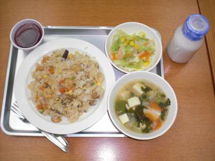 11月26日(月)、今日の献立は、えびチャーハン、わかめスープ、コーンサラダ、ぶどうゼリー、牛乳です。