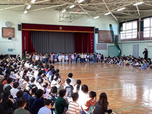 4月15日「1年生を迎える会」が体育館で行われました。今年も元気いっぱいの1年生が入学し、全校児童・職員一同で歓迎の気持ちを込めて温かく迎えました。