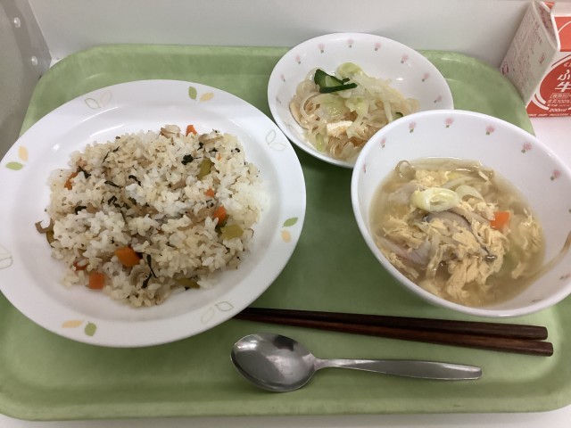 青菜とは一般に小松菜、ほうれん草などの緑の濃い野菜のことです。今日の給食では小松菜をチャーハンに入れました。