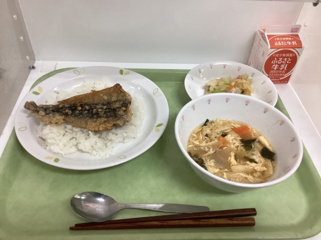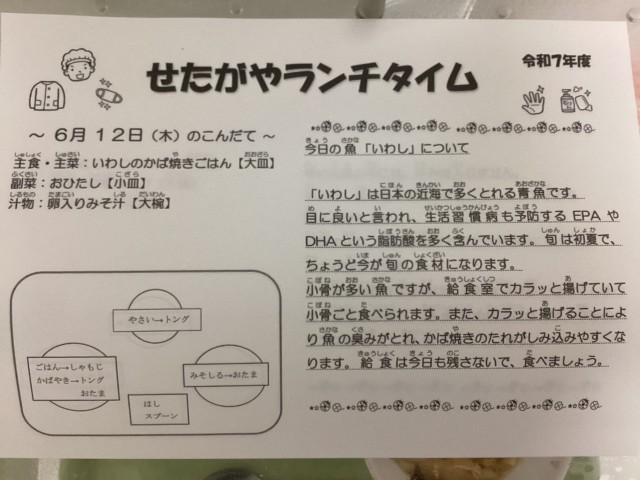 今日の給食のいわしは栄養が豊富で多くの健康効果があります。DHAやEPAだけではなく、ビタミンDやカルシウム、鉄分、タンパク質といった栄養があります。給食では骨まで食べやすいように油で揚げて蒲焼きとしていただきました。骨も丸ごと全部食べたいですね。