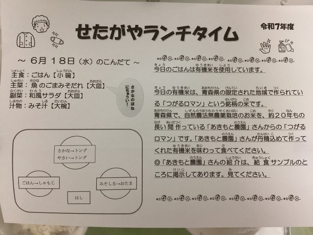 今日の給食のお米は有機米です。青森県の限定された地域でしか作られていない「つがるロマン」という銘柄です。