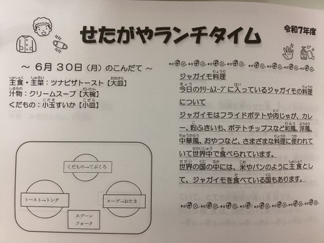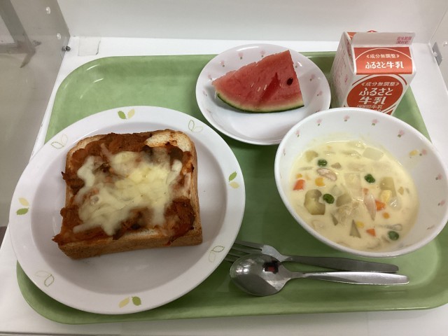 今日の給食は、ツナピザトースト、クリームスープ、小玉スイカ、牛乳でした。スイカは苦手な子もいましたが、好きな子も多くおかわりをしている人がたくさんいました。