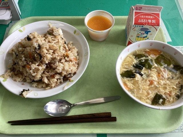 今日の給食はビビンバ、卵とわかめのスープ、キャロットゼリーでした。特にビビンバは人気でした。もっと食べたいという声が上がっていました。