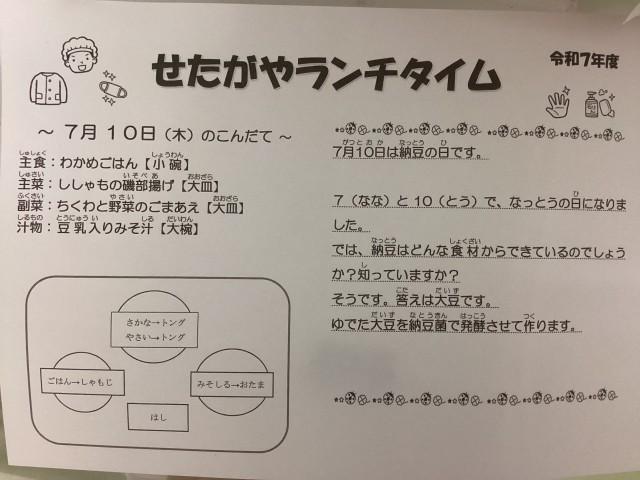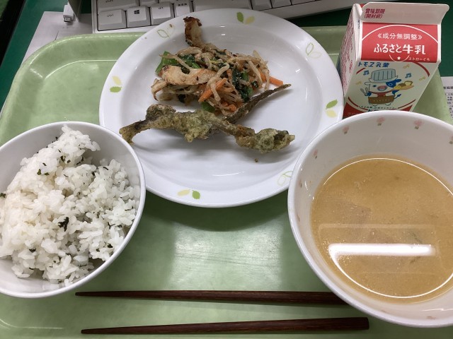 今日の給食わかめごはん、ししゃもの磯辺揚げ、ちくわと野菜のごまあえ、豆乳入りみそ汁でした。特にわかめご飯が人気でした。みんなおかわりしてなくなっているクラスもありました。