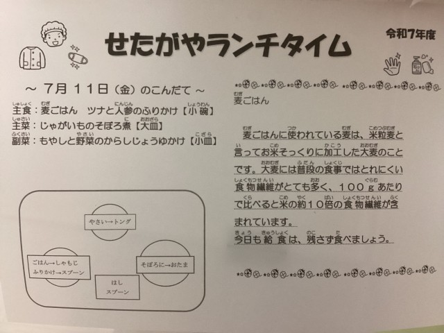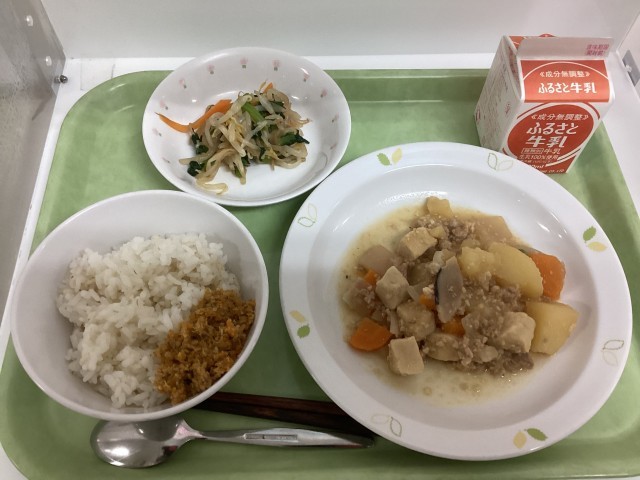 今日の給食は麦ごはん、ツナと人参のふりかけ、じゃがいものそぼろ煮、もやしと野菜のからしじょうゆかけでした。ふりかけをかけたごはんは人気でみんなよくおわかりをしていました。