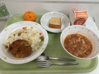 今日の給食は、パエリア、田舎風スープ、フルーツヨーグルトでした。パエリアはエビ...
