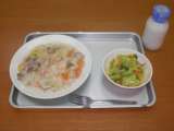 今日の給食は、ミルクパン・鶏肉のからあげ・コーンポテト・白菜と春雨のスープ・牛...