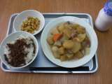 今日の給食は、ごはん・ふりかけ・豚肉と大根のうま煮・ぶどう豆・牛乳です。 大...